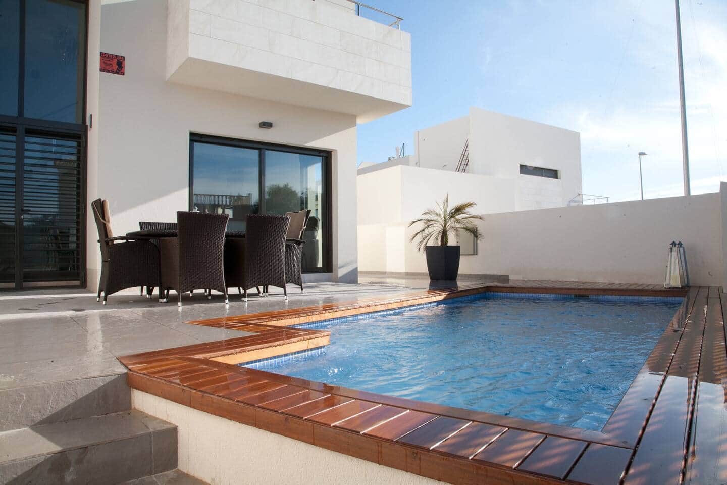 Lovely villa with private pool, 3 bedrooms and 3 bathrooms. Fully equipped kitchen with dishwasher and laundry room. The master bedroom has a balcony, and a rooftop terrace offers beautiful Mediterranean views. Access to a large shared 3-part pool and Japanese garden. Close to La Zenia Boulevard (1 km) and La Zenia Beach (2.5 km). Car recommended. Linen not included – available for rent.